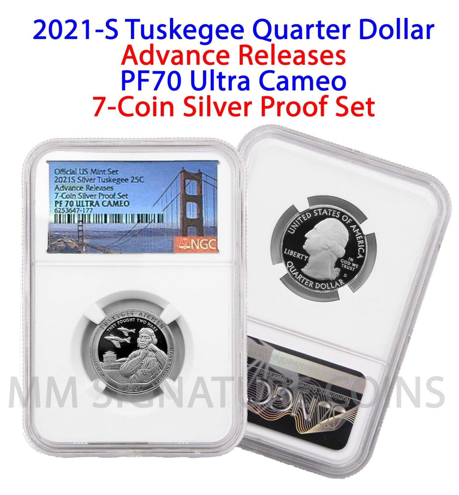 2021-S NGC PF70 .999 Silver Advance Releases Tuskegee Qtr from 7-Coin Silver Set
