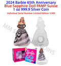 2024 PAMP 1 oz .999 Fine Silver Barbie Coin 65th Blue Sapphire Anniversary w Box