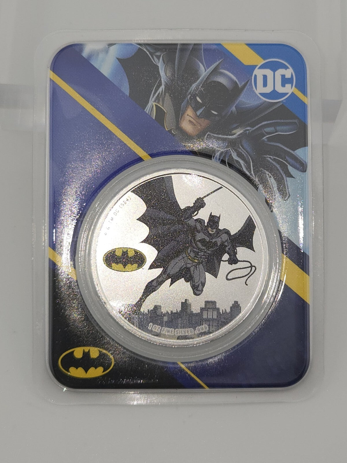 The DC Comics Batman Samoa colorized silver coin.  This coin is the beautiful rendition with Batman swinging over Gotham with the bat signal and high rise buildings behind him.  One oz of 99.9 Fine Silver coin is $5 legal tender in Samoa.