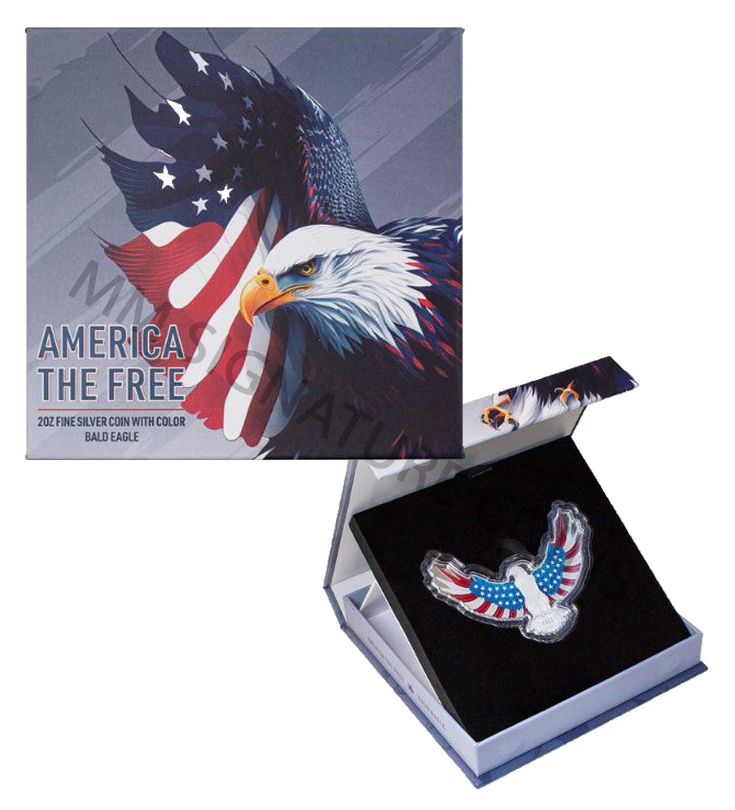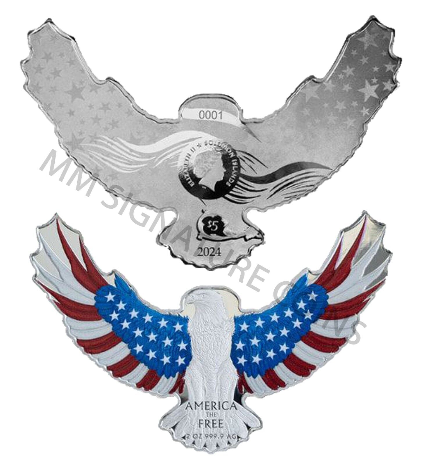 Limited mintage of 2,500, these Bald Eagle Colorized shaped silver coins are 2 troy oz of 99.99% fine silver.  Each coin is individually serialized by PAMP Suisse for the Solomon Islands and is legal tender.  This is the 4th coin in the America The Free series.  The Founding Fathers of the US chose the Bald Eagle to be part of the national emblems in 1782 as a symbol of strength, determination, and honor. Previous editions of the series have featured the American Map Shaped coin, the Statue of Liberty and the Liberty Bell.