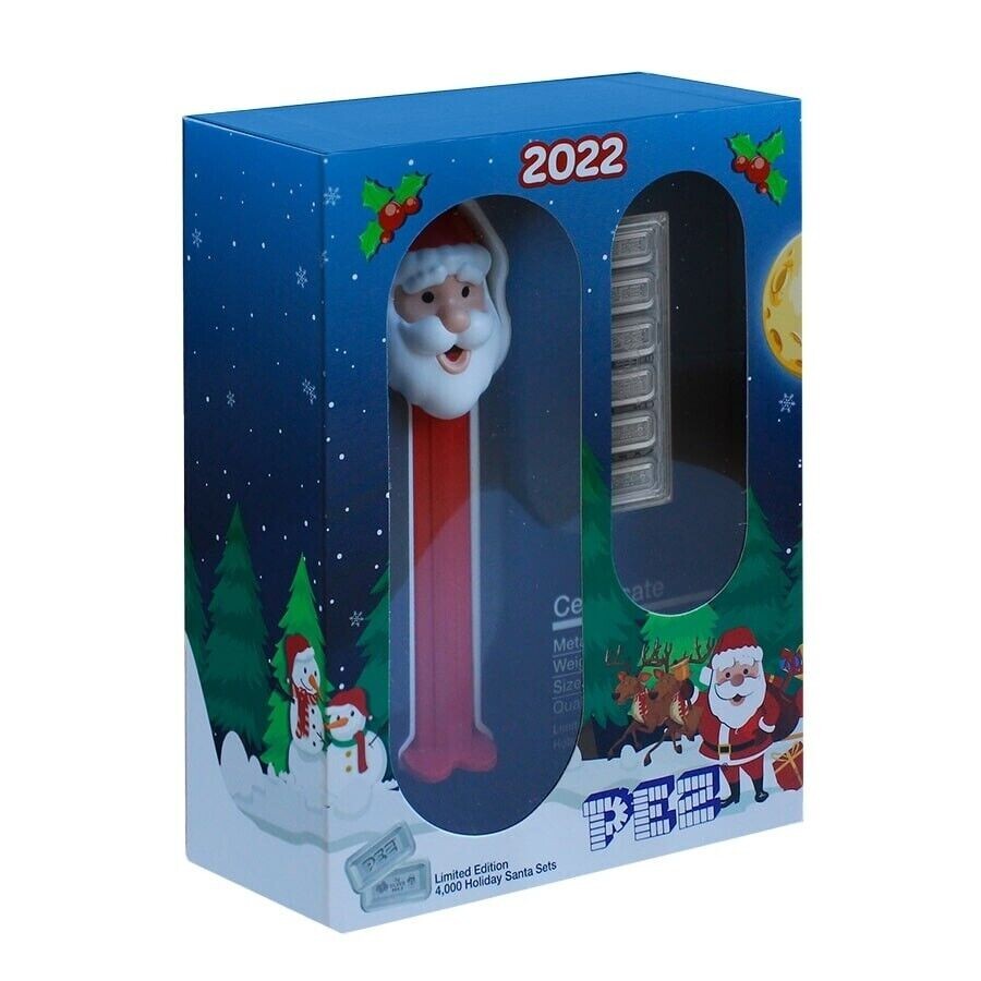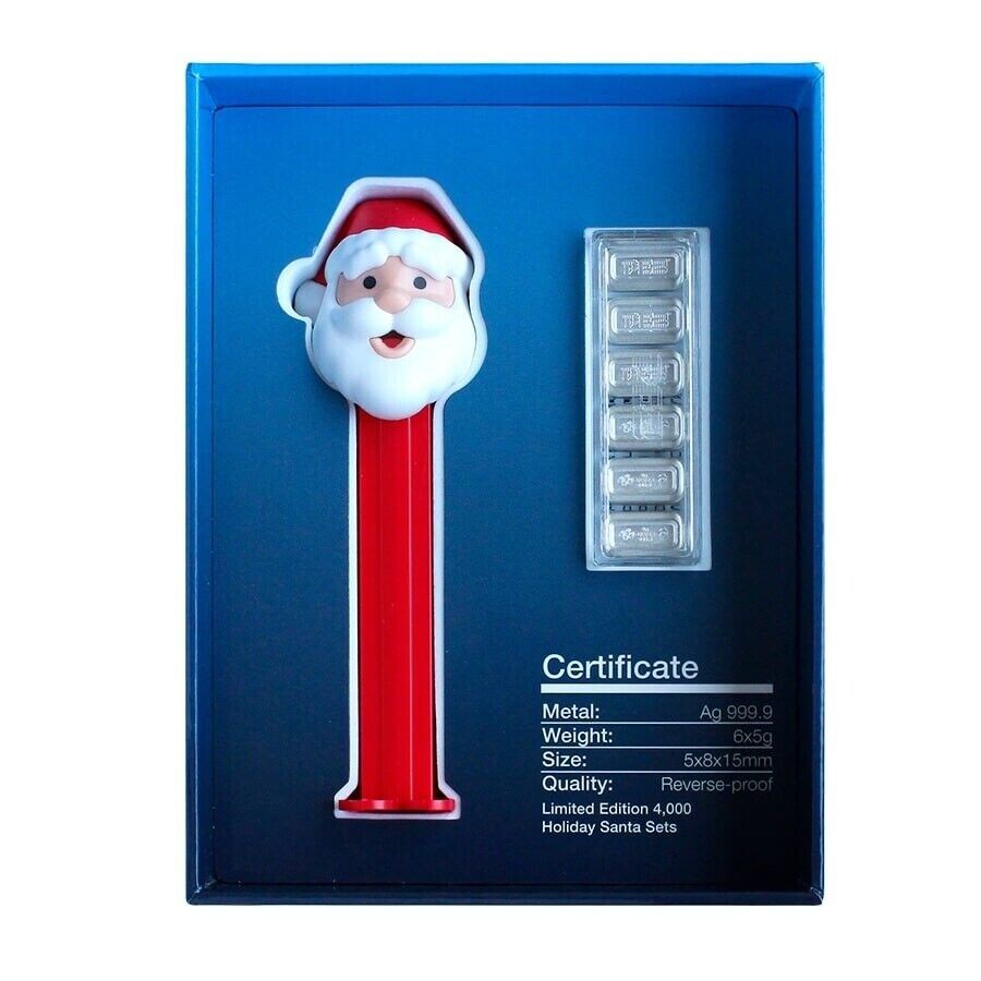 The 30-gram Santa Claus PEZ Dispenser & Silver Wafers (w/Box& COA) from PAMP Suisse! Struck by PAMP Suisse, this product contains 6 bars totaling 30 grams of .9999 fine silver, each one boasting a reverse proof finish. These nostalgic PEZ candy-shaped silver wafers arrive in a custom plastic capsule and arrive in a holiday-themed box. Additionally, this product includes a matching Santa Clause PEZ dispenser! Limited mintage of only 4,000 of these festive 30-gram PAMP Suisse Santa Claus PEZ Dispenser & Silver Wafers (w/Box & COA).