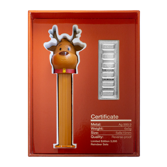 Struck by PAMP Suisse, this product contains 6 bars totaling 30 grams of .9999 fine silver, each one boasting a reverse proof finish. These nostalgic PEZ candy-shaped silver wafers arrive in a custom plastic capsule and arrive in a holiday-themed box. Additionally, this product includes a matching Reindeer PEZ dispenser! Limited mintage of only 3,000 of these festive 30-gram PAMP Suisse Reindeer PEZ Dispenser & Silver Wafers (w/Box & COA).